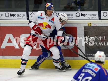 EBEL. Eishockey Bundesliga. EC VSV gegen EC Red Bull Salzburg. Benjamin Lanzinger, (VSV), Thomas Raffl (Salzburg). Villach, am 21.12.2018.