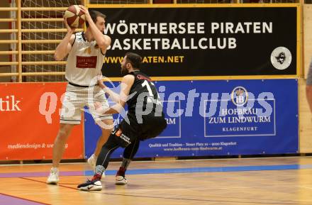 Basketball 2. Bundesliga. Grunddurchgang 19. Runde. Woerthersee Piraten gegen BK Mattersburg Rocks. Maximilian Kunovjanek, (Woerthersee Piraten), Tobias Winkler (Mattersburg). Klagenfurt, am 16.2.2019.