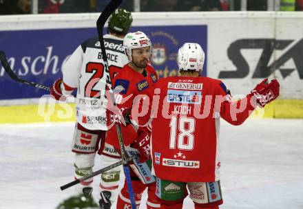 EBEL. Eishockey Bundesliga. KAC gegen HCB Suedtirol Alperia. Torjubel Andrew Jacob Kozek, Thomas Koch (KAC). Klagenfurt, am 1.3.2019.