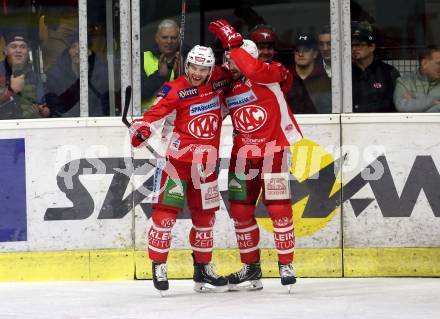 EBEL. Eishockey Bundesliga. KAC gegen HCB Suedtirol Alperia. Torjubel Matthew Neal, Andrew Jacob Kozek (KAC). Klagenfurt, am 17.3.2019.