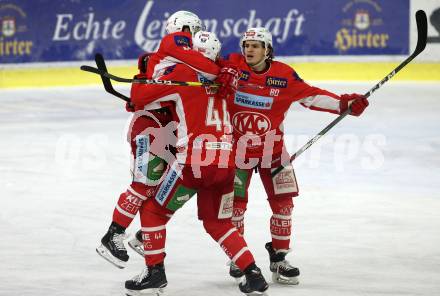 EBEL. Eishockey Bundesliga. KAC gegen HCB Suedtirol Alperia. Torjubel Marcel Witting, Adam Comrie, Nikolaus Kraus (KAC). Klagenfurt, am 22.3.2019.