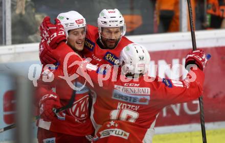 EBEL. Eishockey Bundesliga. KAC gegen Moser Medical Graz99ers. Torjubel Adam Comrie, Thomas Koch, Andrew Jacob Kozek (KAC). Klagenfurt, am 31.3.2019.