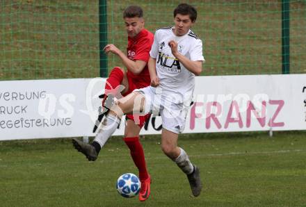 Fussball 1. Klasse A. Doelsach gegen Hermagor. Philipp Hochegger, (Doelsach), Marin Brkovic (Hermagor). Doelsach, am 6.4.2019.