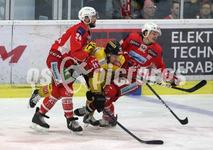 EBEL. Eishockey Bundesliga. KAC gegen spusu Vienna Capitals. Steven Strong, Nikolaus Kraus, (KAC), Julian Grosslercher (Vienna Capitals). Klagenfurt, am 16.4.2019.