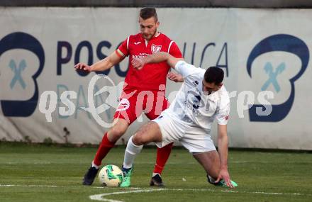 Fussball Kaerntner Liga. SAK gegen ATUS Ferlach. Daniel Camber, (SAK), Martin Posratschnig (Ferlach). Klagenfurt, am 18.4.2019.