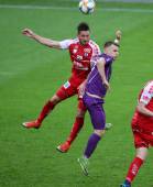 Fussball. 2. Liga. ‎SK Austria Klagenfurt gegen SK Vorwaerts Steyr. Carlos Badal Andani, (Klagenfurt), Benedikt Pichler, Josip Martinovic (Vorwaerts Steyr). Klagenfurt, 29.5.2019.