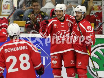 Eishockey. CHL. Europa Champions Hockey League. KAC gegen Frisk Asker (Norwegen). Torjubel Manuel Ganahl, Daniel Obersteiner, Martin Schumnig (KAC). Klagenfurt, am 31.8.2019.
