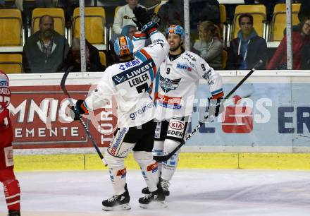 EBEL. Eishockey Bundesliga. KAC gegen EHC Liwest Black Wings Linz. Torjubel Lebler Brian, Schofield Rick (Linz). Klagenfurt, am 29.9.2019.