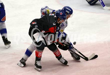 EBEL. Eishockey Bundesliga. EC VSV gegen HC TWK Innsbruck. Bernd Wolf, (VSV), Lukas Baer (Innsbruck). Villach, am 4.10.2019.