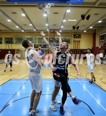 Basketball Zweite Liga 2019/2020. Grunddurchgang 11. Runde. Woerthersee Piraten gegen Mattersburg Rocks. Tevz Ruzic, Lukas Simoner (Piraten), Corey Hallett (Mattersburg). Klagenfurt, am 23.11.2019.