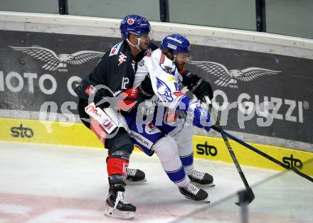 EBEL. Eishockey Bundesliga. EC VSV gegen HC TWK Innsbruck. Patrick Bjorkstrand, (VSV), Thomas Vallant (Innsbruck). Villach, am 3.12.2019.