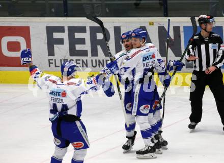 EBEL. Eishockey Bundesliga. VSV gegen HC Orli Znojmo. Torjubel Collins Chris, Karlsson Anton, Fraser Jamie (VSV). Villach, am 21.2.2020.