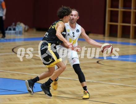 Basketball Austria Cup. Woerthersee Piraten gegen Fuerstenfeld Panthers. Samo Udrih (Piraten), Lukas Hahn (Fuerstenfeld). Klagenfurt, am 20.9.2020.