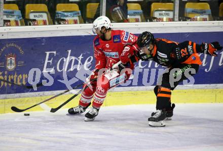 EBEL. Eishockey Bundesliga. KAC gegen Moser Medical Graz99ers. Martin Schumnig, (KAC), Samuel Hunter Fejes (Graz). Klagenfurt, am 4.10.2020.