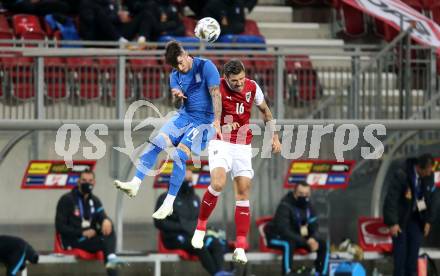 Fussball Laenderspiel. Oesterreich gegen Griechenland. Christopher Trimmel, (Oesterreich), Taxiarchis Fountas (Griechenland). Klagenfurt Woerthersee Stadion, am 7.10.2020.