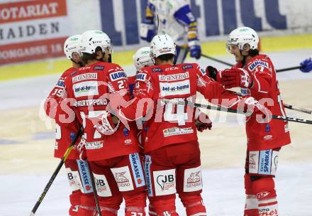 EBEL. Eishockey Bundesliga. KAC gegen VSV. Torjubel Hundertpfund Thomas, Steffler Kele, Bischofberger Johannes, Eriksson Fredrik, Ganahl Manuel (KAC). Klagenfurt, am 9.10.2020.