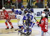 EBEL. Eishockey Bundesliga. KAC gegen	VSV. Torjubel Clemens Unterweger, Johannes Bischofberger, Gregorc Blaz (KAC). Klagenfurt, am 9.10.2020.