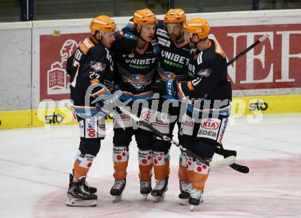 EBEL. Eishockey Bundesliga. VSV gegen Black Wings LINZ 1992. Torjubel Moritz Matzka, Brian Lebler, Dragan Umicevic, Marc-Andre Dorion (Linz). Villach, am 6.12.2020.