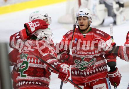 EBEL. Eishockey Bundesliga. KAC gegen spusu Bratislava Capitals. Torjubel Ticar Rok, Petersen Nicholas Eric, Geier Stefan (KAC). Klagenfurt, am 13.12.2020.