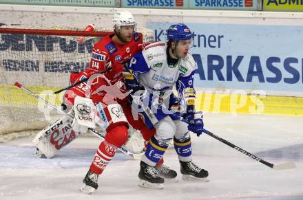 EBEL. Eishockey Bundesliga. KAC gegen VSV. Paul Postma, (KAC), Jordan Caron (VSV). Klagenfurt, am 3.1.2021.