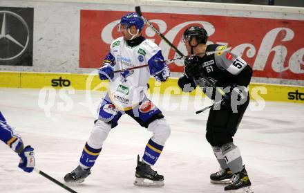 EBEL. Eishockey Bundesliga. VSV gegen Dornbirn Bulldogs. Josef Hrabal, (VSV), Daniel Woger (Dornbirn). Villach, am 14.2.2021.