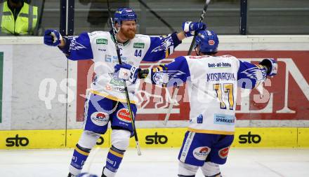 EBEL. Eishockey Bundesliga. VSV gegen Dornbirn Bulldogs. Torjubel Jamie Fraser, Scott Kosmachuk (VSV). Villach, am 14.2.2021.