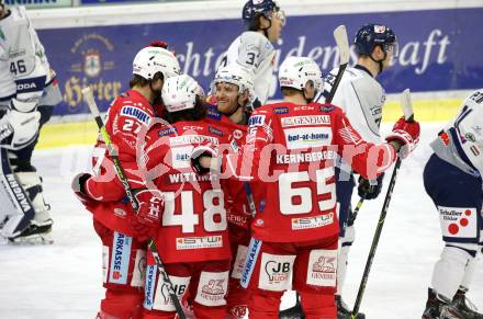 EBEL. Eishockey Bundesliga. KAC gegen Fehervar AV19. Torjubel Thomas Hundertpfund, Samuel Witting, Johannes Bischofberger, Michael Kernberger (KAC). Klagenfurt, am 7.3.2021.