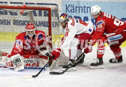 EBEL. Eishockey Bundesliga. KAC gegen EC Red Bull Salzburg. Sebastian Dahm, Matthew Fraser, (KAC), Florian Baltram (Salzburg). Klagenfurt, am 1.4.2021.