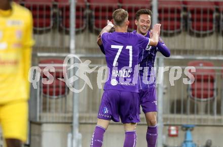 Fussball 2. Liga. SK Austria Klagenfurt gegen Kapfenberger SV. Torjubel Benjamin Hadzic, Oliver Markoutz (Klagenfurt). Klagenfurt, am 9.4.2021.