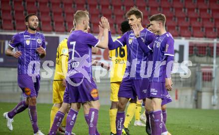 Fussball 2. Liga. SK Austria Klagenfurt gegen Kapfenberger SV. Torjubel Markus Pink, Florian Jaritz, Thorsten Mahrer, Tim Maciejewski (Klagenfurt). Klagenfurt, am 9.4.2021.
