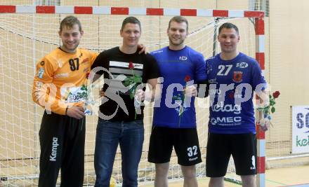 Handball spusu Liga. SC Ferlach gegen UHK Krems. Ziga Urbic, Rok Golcar, Matic Kotar, Blac Klec (Ferlach). Ferlach, am 15.5.2021.