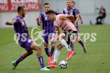 Fussball. Bundesliga. SK Austria Klagenfurt gegen TSV Hartberg. Markus Pink, Florian Rieder, (Klagenfurt), David Stec (Hartberg). Klagenfurt, am 7.8.2021.