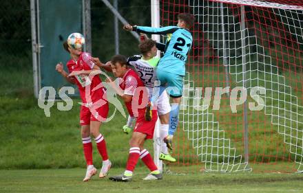 Fussball Kaerntner Liga. St. Andrae/WAC Juniors gegen Feldkirchen. Raphael Fritzl, Nino Emanuel Hartweger, Nino Lesjak (St. Andrae), Michael Groinig (Feldkirchen). St. Andrae, am 27.8.2021.