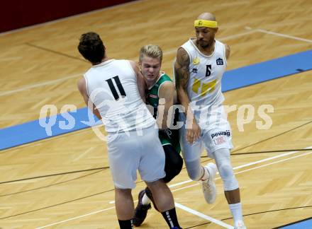 Basketball Zweite Liga 2021/2022. Grunddurchgang 1. Runde. Woerthersee Piraten gegen Future Team Steiermark. Andreas Nuck, Shawn Ray (Piraten), Lukas Ablasser (Steiermark). Klagenfurt, am 10.10.2021.
