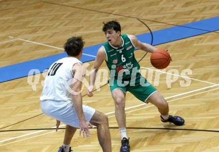 Basketball Zweite Liga 2021/2022. Grunddurchgang 1. Runde. Woerthersee Piraten gegen Future Team Steiermark. Simon Finzgar (Piraten), Elias Podany (Steiermark). Klagenfurt, am 10.10.2021.