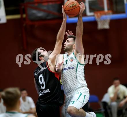 Basketball Zweite Liga 2021/2022. Grunddurchgang 2. Runde.  KOS Celovec gegen Mattersburg Rocks. Marin Sliskovic (KOS), Tobias Winkler  (Mattersburg). Klagenfurt, am 16.10.2021.