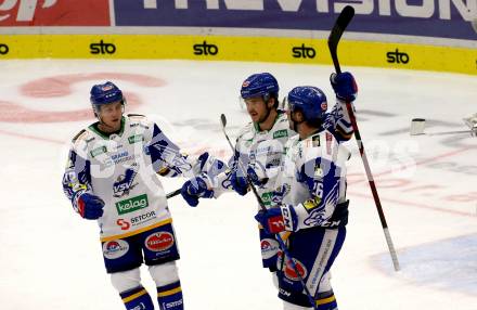 EBEL. Eishockey Bundesliga. VSV gegen Moser Medical Graz99ers. Torjubel Benjamin Lanzinger, Renars Krastenbergs, Joel Broda (VSV). Villach, am 17.10.2021.