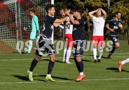 Fussball. Kaerntner Liga. Ferlach Atus gegen ATSV Wolfsberg. Torjubel Bastian Rupp, Maximilian Sorger (Wolfsberg). Ferlach, 23.10.2021.