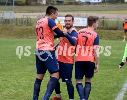 Fussball. 1. Klasse D. DSG Ferlach gegen Tainach. Torjubel Adnan Huremovic, Guenther Zussner, Niklas Michael Gottfried Roscher (Tainach). Ferlach, 6.11.2021.