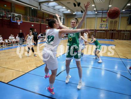 Basketball Damen Superliga 2021/2022. Grunddurchgang 5. Runde.  KOS Celovec Damen gegen UBI Graz.  Patricia Pauer (KOS), Camilla Neumann  (Graz). Klagenfurt, am 20.11.2021.