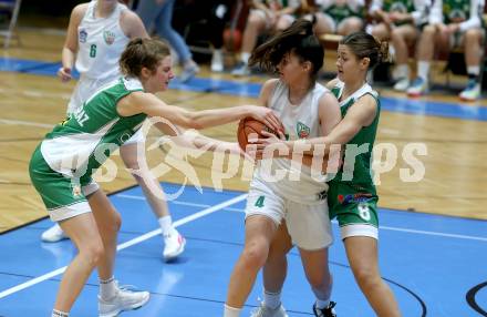 Basketball Damen Superliga 2021/2022. Grunddurchgang 5. Runde. KOS Celovec Damen gegen UBI Graz. Sasa Tomazic (KOS), Camilla Neumann,Eva Fellner (Graz). Klagenfurt, am 20.11.2021.