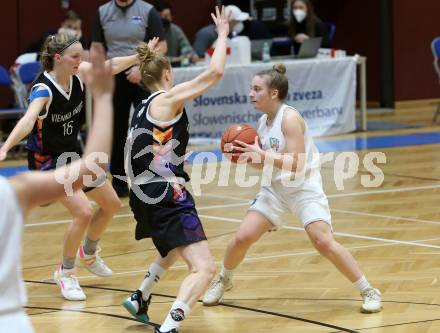 Basketball. Damen Basketball Austria Cup 2021/2022. KOS Celovec Damen gegen Vienna United Post SV. Monika Ristic (KOS), Lena Eichler , Michelle Slunecko (Vienna). Klagenfurt, am 27.11.2021.
