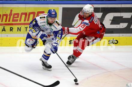 EBEL. Eishockey Bundesliga. VSV gegen KAC. Felix Maxa, (VSV), Manuel Geier (KAC). Villach, am 4.1.2022.