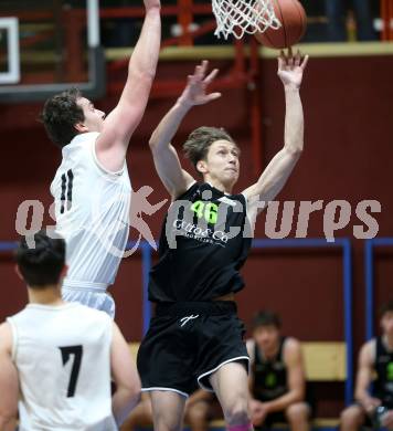 Basketball Zweite Liga 2021/2022. Grunddurchgang 14. Runde. Woerthersee Piraten gegen Basket Flames. Andreas Nuck (Piraten), Patrick Fister (Basket Flames). Klagenfurt, am 29.1.2022.