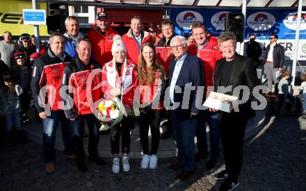Schi Alpin. Empfang Olympiasiegerin Katharina Truppe. Karl Jaritz, Ferdinand Knees, Katharina Truppe, Elisa Torkar, Anton Leikam, Arno Arthofer, hinten: Fritz Strobl, Thomas Morgenstern, Karl Schnabl, Dieter Moertl. Latschach, Finkenstein, am 23.2.2022.