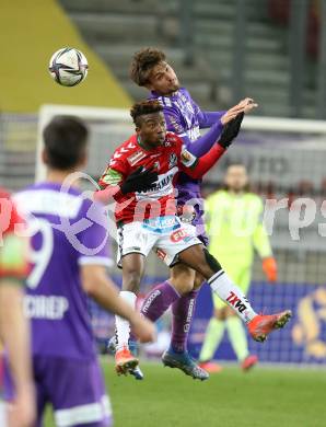 Fussball Bundesliga. SK Austria Klagenfurt gegen SV Guntamatic Ried. Thorsten Mahrer, (Klagenfurt), Dorgeles Nene (Ried). Klagenfurt, am 27.2.2022.