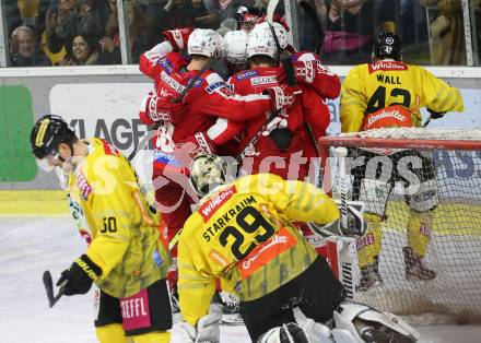 EBEL. Eishockey Bundesliga. KAC gegen	spusu Vienna Capitals. Torjubel Stefan Geier, Lukas Haudum, Manuel Geier, Thomas Vallant (KAC). Klagenfurt, am 20.3.2022.