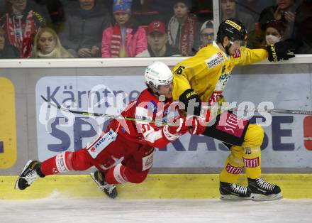 EBEL. Eishockey Bundesliga. KAC gegen spusu Vienna Capitals. Fabian Hochegger, (KAC), Simeon Schwinger (Vienna Capitals). Klagenfurt, am 20.3.2022.