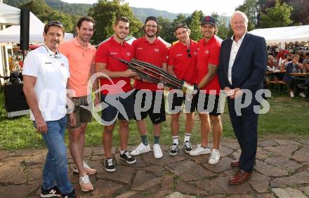 Eishockey Bundesliga. Pokaluebergabe durch Gemeinde Keutschach.   Oliver Pilloni, Clement Leitner, Thomas Vallant, Manuel Ganahl, Johannes Bischofberger, Daniel Obersteiner,  Buergermeister Gerhard Oleschko. Keutschach, am 29.8.2022.