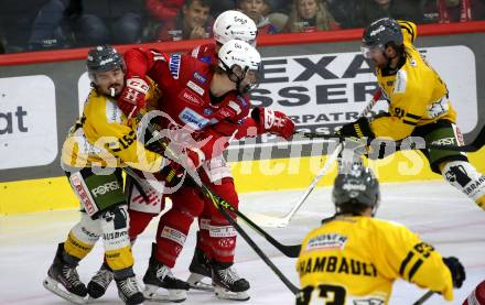 EBEL. Eishockey Bundesliga. EC KAC gegen HC Pustertal Woelfe. Finn Van Ee, Thomas Vallant, (KAC), Dante Hannoun (Pustertal). Klagenfurt, am 18.11.2022.